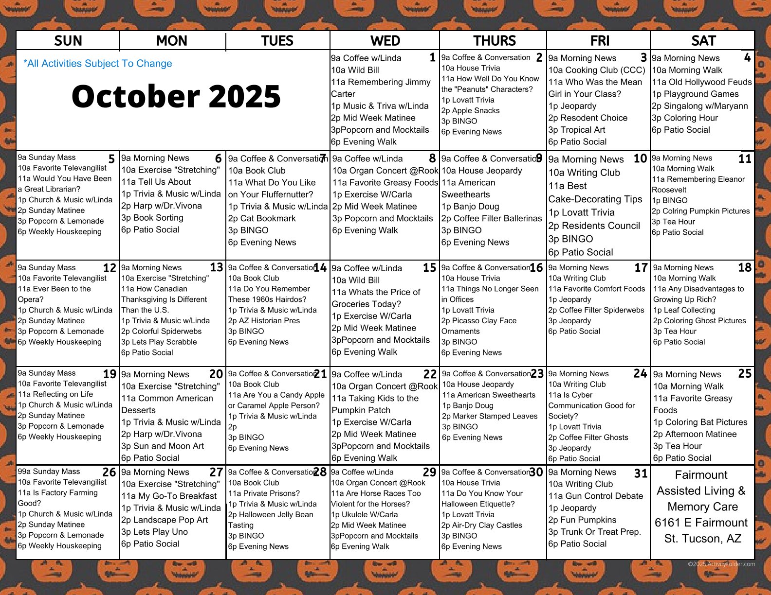 Music abounds at Fairmount. Banjo, piano, guitar, sing-alongs, and harp music are some of our regularly scheduled programs. How about FUN!? Special guests, miniature ponies, birthday parties, and holidays are important in honoring the past and present, as well as a providing a time for visiting with friends and family. These activities together support the soul and empower the spirit.